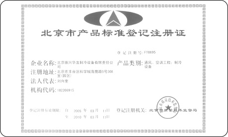 2005年,公司制冷設備產品被北京市質量技術監督局授予“北京市產品標準登記注冊證”。